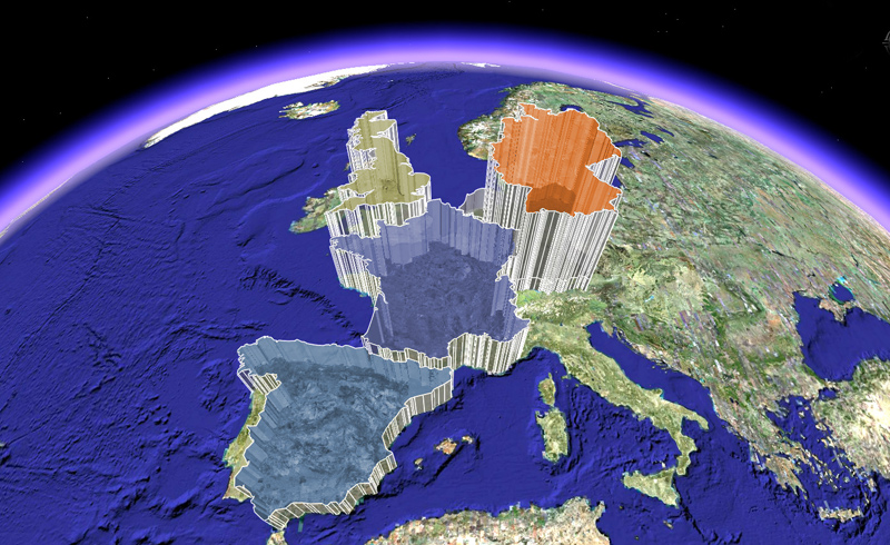 Manager visualisieren ihre Zahlen in GE nach Ländern, Regionen, Städten, Niederlassungen - als Säulendiagramme, als farbige Flächen - alles direkt auf der Erdkugel.